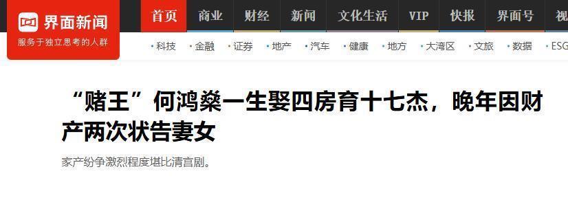 界面新闻——“赌王”何鸿燊一生娶四房育十七杰,晚年因财产两次状告妻女2020年05月26日
